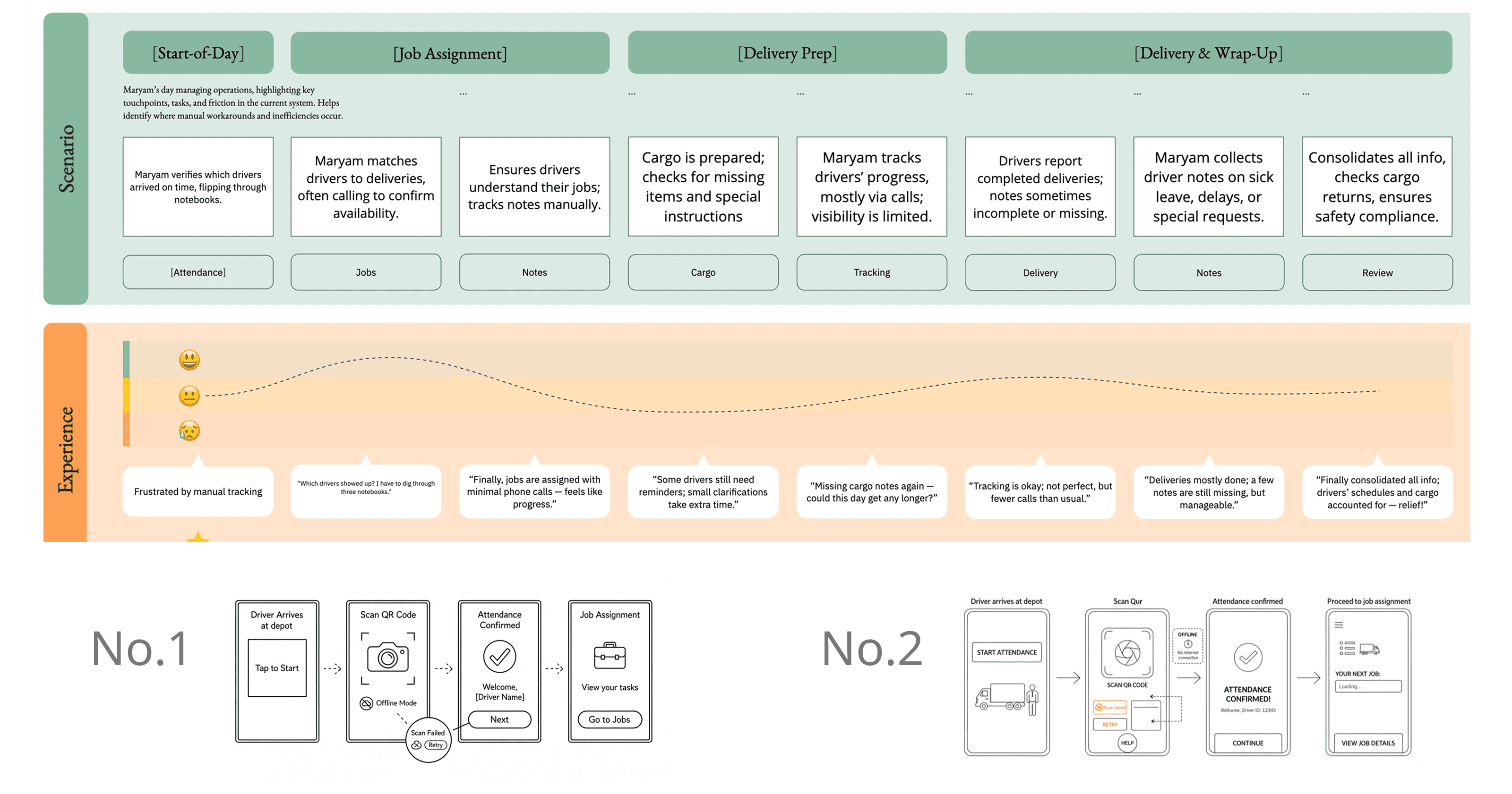 Now, Maryam sees real-time driver status (green/yellow/red) on her dashboard. She assigns jobs with a two-step confirm flow — no more misassignments. Driver notes (sick, late, special requests) live right next to their profile — no more scribbling in notebooks. Offline mode ensures nothing gets lost. Most importantly: she doesn’t need her notebooks anymore. The system finally captures what she was writing down every day — and works when phones don’t.